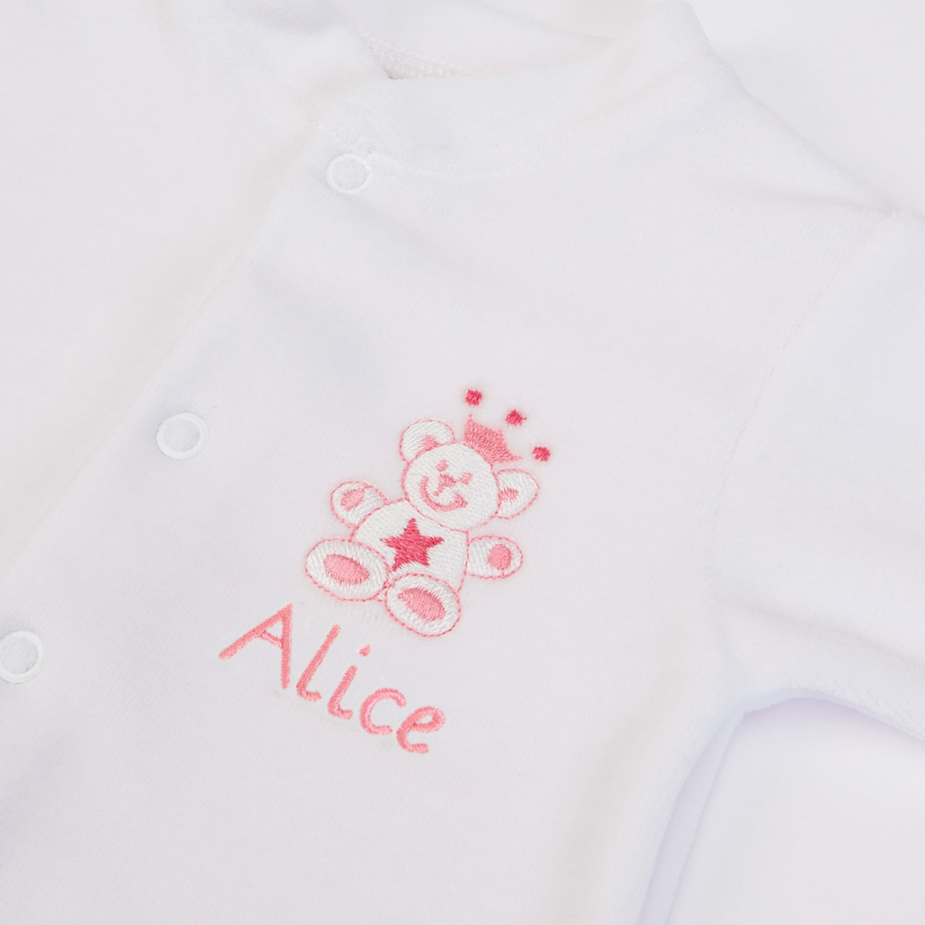 Babygrow em veludo com abertura na frente. Deve indicar o nome que deseja personalizar no artigo nas informações adicionais no ponto 6 Confirmar dados da compra no carrinho de compras.